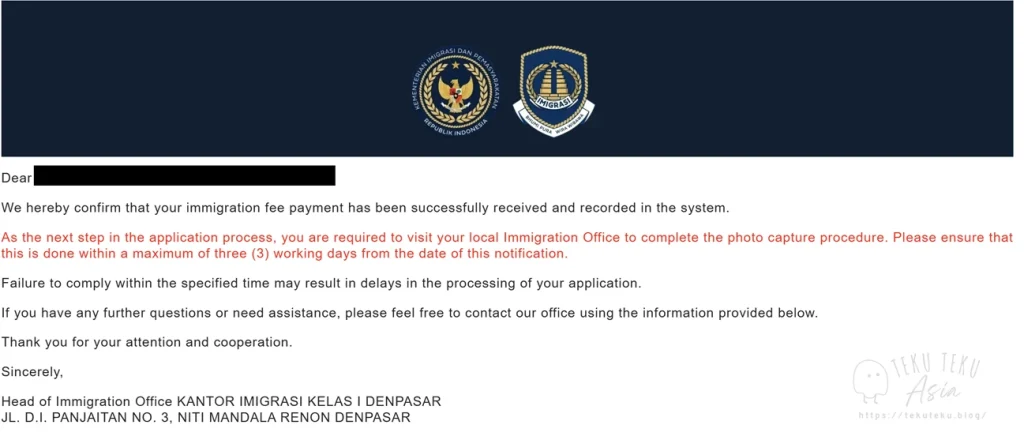 バリ島のビザ延長申請はかれこれ4回目。さくさく支払いを完了させると見たことのないメールが送られてきました。こいつが今回の本丸です。