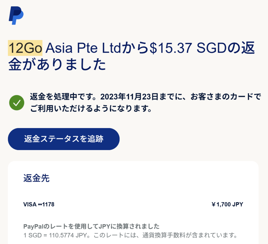 この時はPaypal経由での支払いだったので余計に不安でしたが、12Goのログイン画面からログインし、該当の予約を確認→キャンセル申請からキャンセルをして、2日でキャンセル&返金が処理されました。