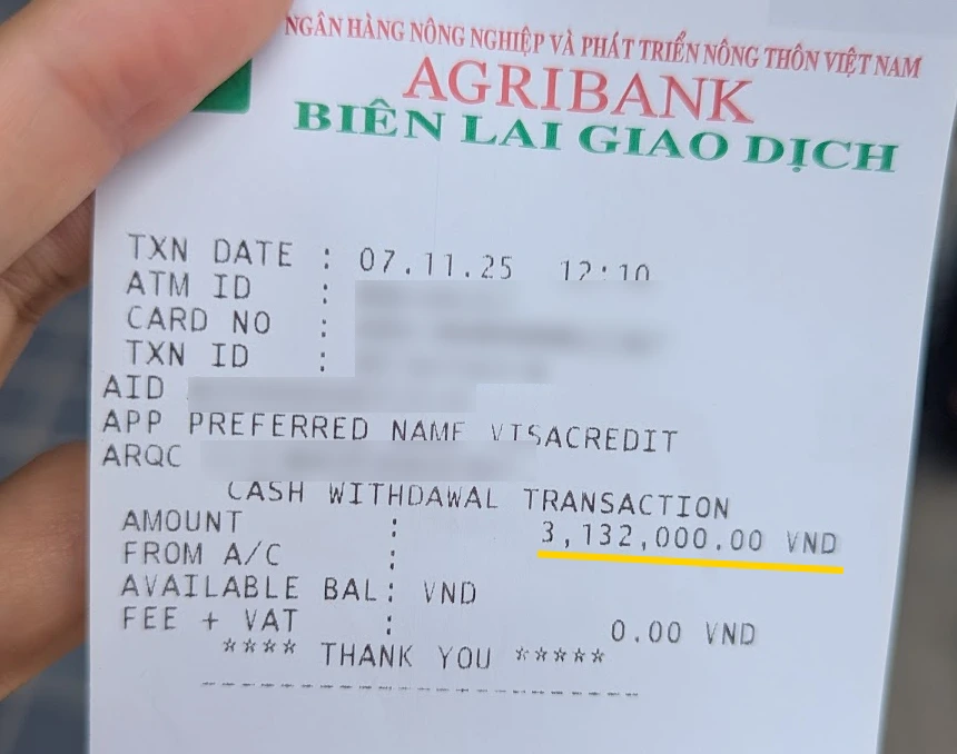 ↓こちらが実際にAGRI BANKで3,000,000ドン分引き出したレシートです。